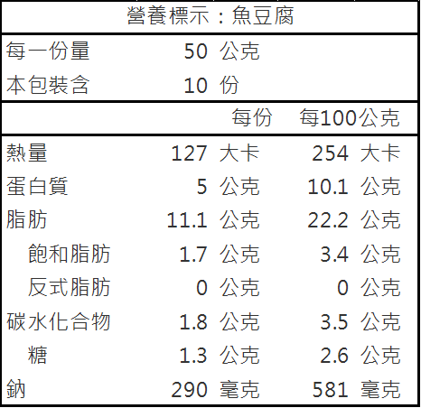 | 成分 | 魚肉(金線魚)、水、大豆油、分離大豆蛋白、醋酸澱粉、食鹽、L-麩酸鈉、5’-次黃嘌呤核苷磷酸二鈉、雞蛋白粉、葡萄糖、乳酸鈣 |